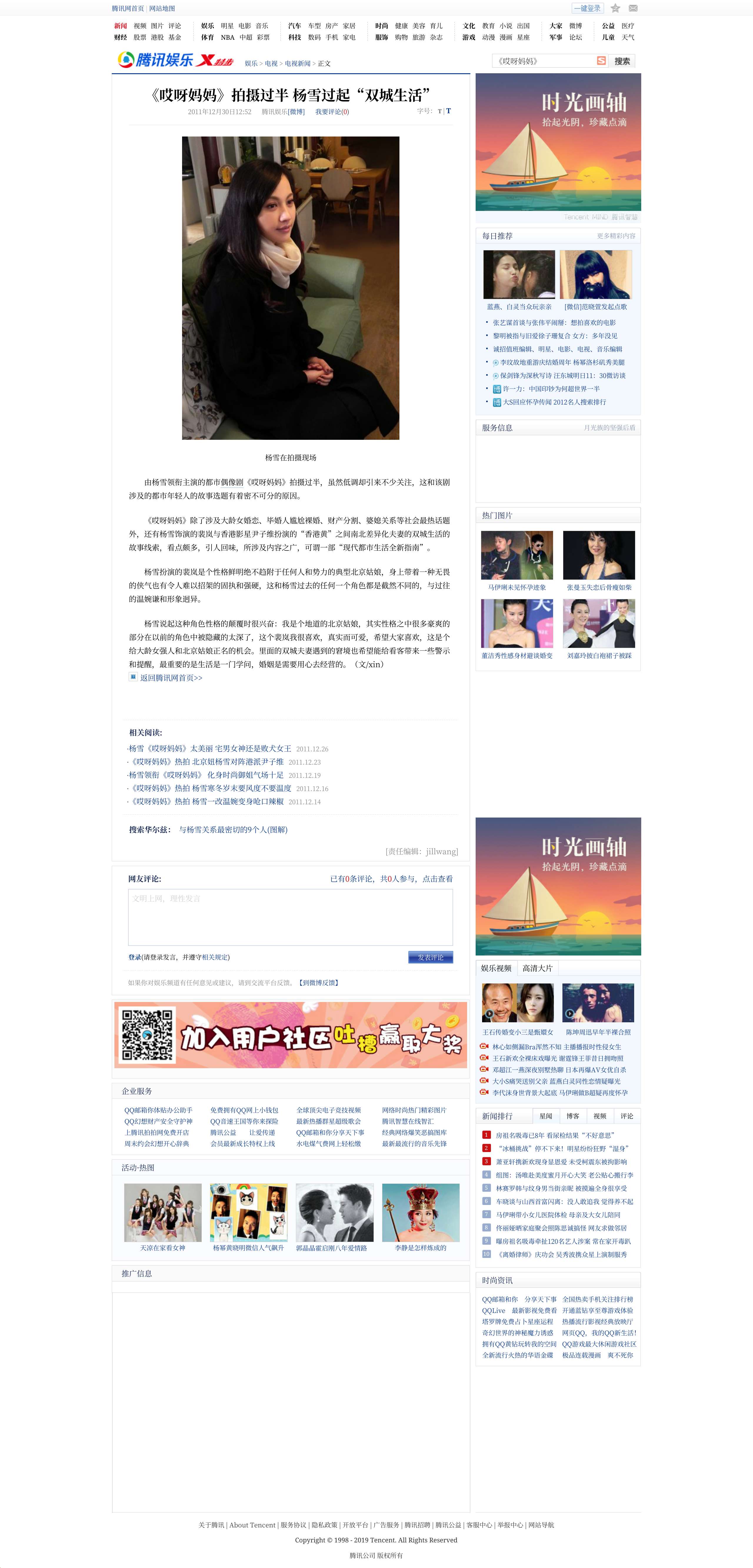 这个有着天使面庞、魔鬼身材的女孩演艺事业蒸蒸日上,但却没有一点儿傲气和世故。在这个充满名利诱惑的演艺圈里,杨雪一直简单地生活着,快乐、美丽、健康就在这种简单中延续。(环球在线评)
